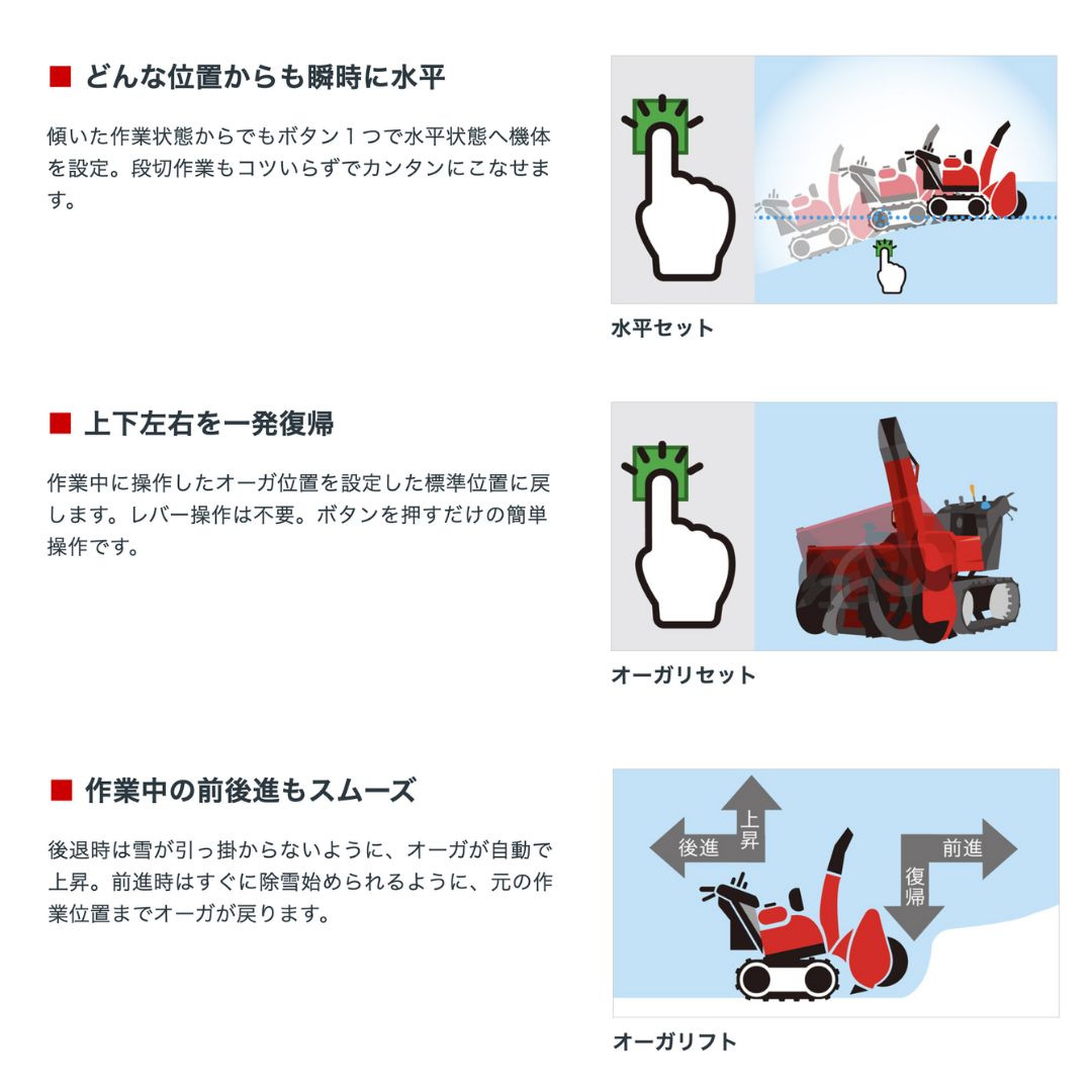 機体の傾きを感知し、オーガの角度を自動調整。常に安定した除雪作業が行え、ワンタッチの「オーガリセット」で水平位置への復帰もスムーズ。